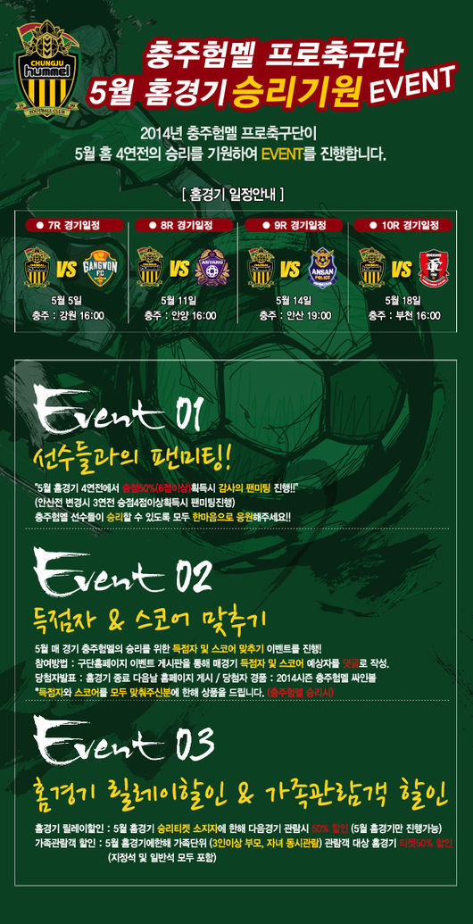 먼저 5월 홈경기 4연전에서 승점50%에 해당하는 6점 이상을 획득할시 감사의 팬미팅을 진행할 예정이며, 매 경기 승리를 염원하는 마음을 담아 충주험멜 득점자와 경기스코어를 맞추는 온라인 이벤트를 구단홈페이지를 통해 진행한다. (www.hummelfc.com)