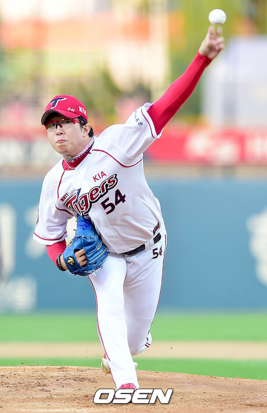KIA 선발 양현종이 힘차게 공을 뿌리고 있다.