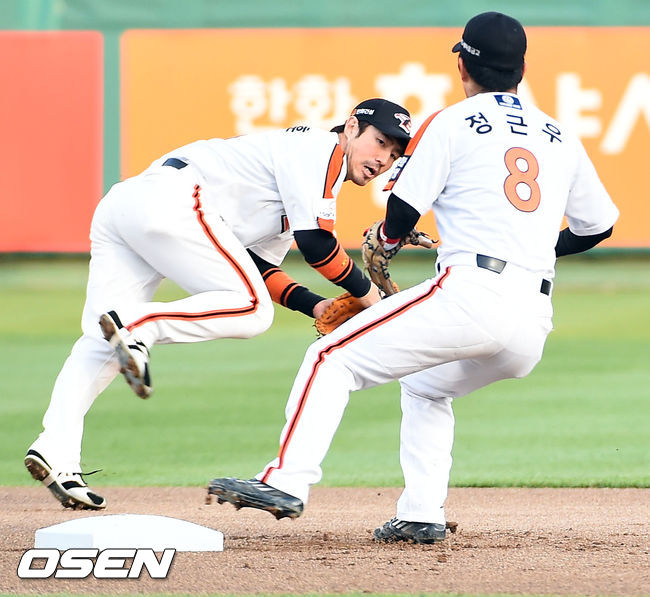 1일 오후 대전구장에서 열린 '2014 한국야쿠르트 세븐프로야구' 한화 이글스와 롯데 자이언츠의 경기, 1회초 1사 1루 롯데 손아섭의 내야땅볼때 한화 유격수 한상훈이 정근우와 키스톤플레이 펼치며 병살아웃 시도하고 있다.