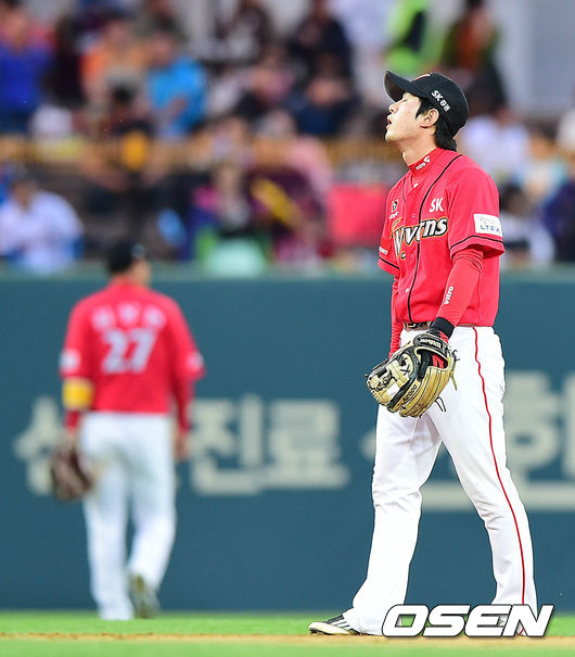 1회말 KIA 공격 2사 2, 3루 상황 차일목의 땅볼 타구를 더듬으며 실책을 범한 SK 유격수 김성현이 아쉬워하고 있다.