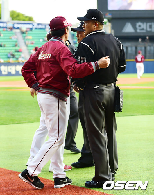 1일 오후 서울 잠실야구장에서 열린 ‘2014 한국야쿠르트 세븐 프로야구’ 두산 베어스와 넥센 히어로즈 경기, 1회초 2사 후 넥센 윤석민이 삼진아웃을 당한 상황. 넥센 덕아웃에서 볼판정에 불만을 나타내자 윤상원 주심과 이영재 3루심이 넥센 덕아웃으로 다가가 이야기를 나누고 있다.