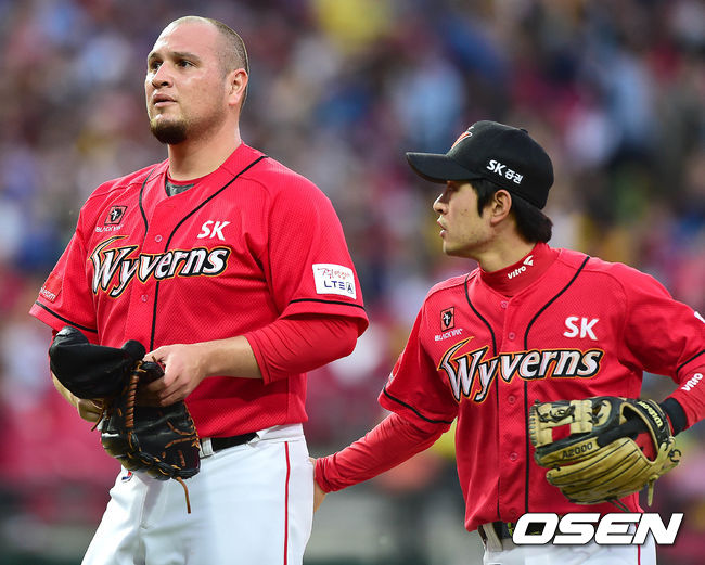 1회말 KIA 공격에서 4실점한 SK 선발 레이예스가 이닝을 마치고 더그아웃으로 들어갈 때 이번 이닝에서 2실책을 범한 유격수 김성현이 미안함을 표시하고 있다.
