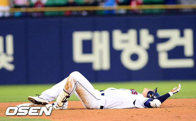 1일 오후 서울 잠실야구장에서 열린 ‘2014 한국야쿠르트 세븐 프로야구’ 두산 베어스와 넥센 히어로즈 경기, 3회말 2사 주자없는 상황에서 우익수 오른쪽 안타를 날리고 2루로 달리던 두산 민병헌이 넥센 강정호에게 태그아웃 되자 그라운드에 누워 아쉬워 하고 있다.