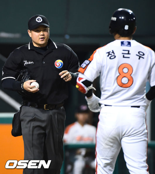 1일 오후 대전구장에서 열린 '2014 한국야쿠르트 세븐프로야구' 한화 이글스와 롯데 자이언츠의 경기, 3회초 1사 이기중 구심이 한화 정근우를 판정번복하며 낫아웃 포일로 1루로 진루 시키고 있다.
