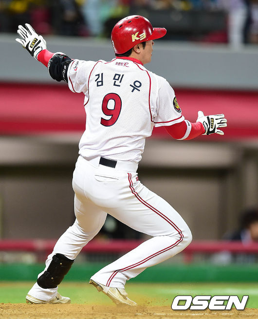 3회말 KIA 공격 1사 1루 상황 김민우가 좌월 투런포를 날리고 있다.