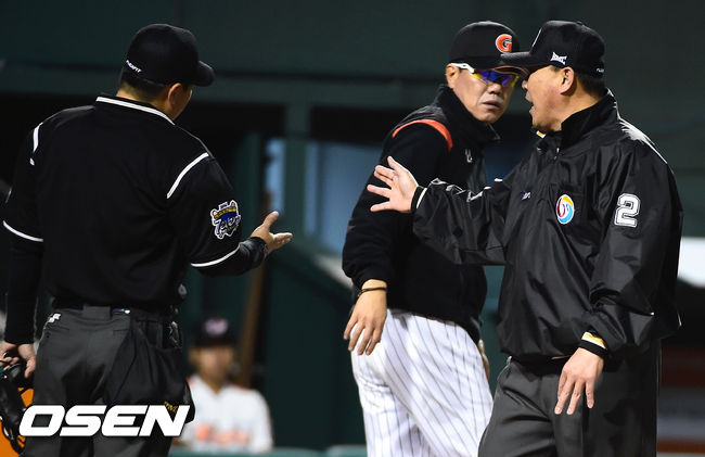 1일 오후 대전구장에서 열린 '2014 한국야쿠르트 세븐프로야구' 한화 이글스와 롯데 자이언츠의 경기, 3회초 1사 이기중 구심이 한화 정근우를 판정번복하며 낫아웃 포일로 1루로 진루 시켰다. 김시진 감독이 이기중 구심에게 항의하고 있다.
