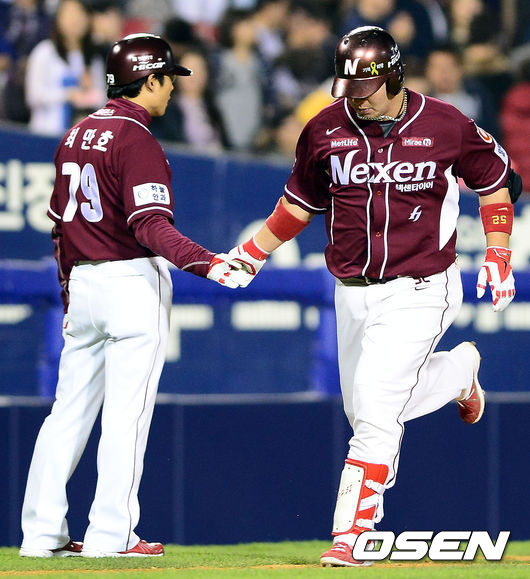 1일 오후 서울 잠실야구장에서 열린 ‘2014 한국야쿠르트 세븐 프로야구’ 두산 베어스와 넥센 히어로즈 경기, 6회초 2사 1루 투런포를 날린 박병호가 그라운드를 돌며 최만호 코치와 하이파이브를 나누고 있다.