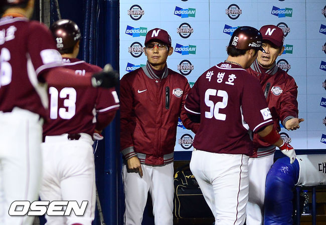 1일 오후 서울 잠실야구장에서 열린 ‘2014 한국야쿠르트 세븐 프로야구’ 두산 베어스와 넥센 히어로즈 경기, 6회초 2사 1루 투런포를 날린 넥센 박병호가 덕아웃에서 염경엽감독외 코치들로부터 환호를 받고 있다.