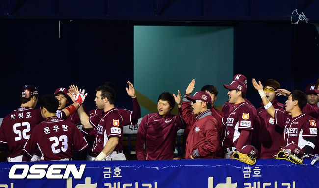 1일 오후 서울 잠실야구장에서 열린 ‘2014 한국야쿠르트 세븐 프로야구’ 두산 베어스와 넥센 히어로즈 경기, 6회초 2사 1루 투런포를 날린 박병호가 덕아웃에서 동료들로 부터 환호를 받고 있다.