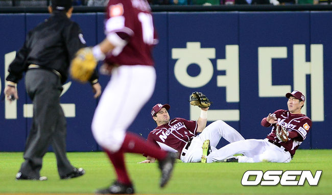 1일 오후 서울 잠실야구장에서 열린 ‘2014 한국야쿠르트 세븐 프로야구’ 두산 베어스와 넥센 히어로즈 경기, 5회말 무사 주자없는 상황에서 양의지의 좌중간 안타를 잡기 위해 넥센 유한준과 로티노가 몸을 던지고 있다.