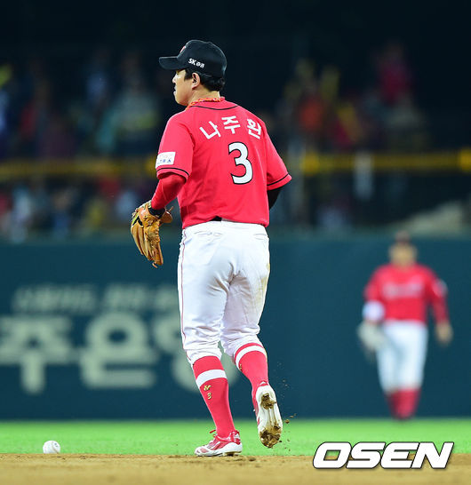 6회말 KIA 공격 1사 1, 2루 상황 대타 이종환의 내야 땅볼 때 SK 2루수 나주환이 볼을 놓치는 실책을 범한 뒤 아쉬워하고 있다. 팀 일곱번째 실책.