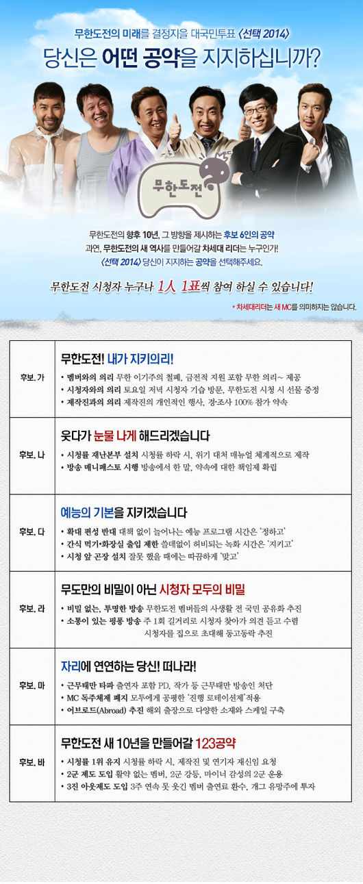 MBC는 공식 홈페이지를 통해 ‘무한도전’의 미래를 결정 지을 대국민 투표를 시작했다. 이른 바 ‘선택 2014’라는 제목의 설문조사.