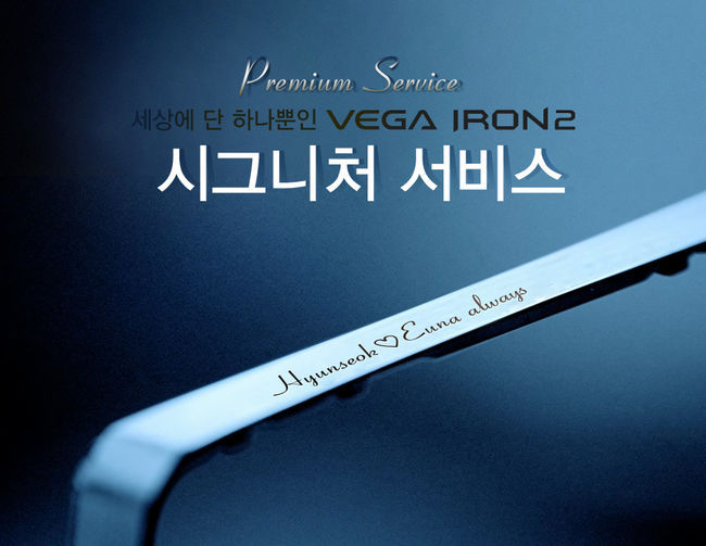 ‘시그니처 서비스’는 베가 아이언의 메탈 소재를 활용한 프리미엄 서비스이다. 견고하고 고급스러운 Endless Metal에 레이저 마킹기로 글자나 기호를 정교하게 각인시킨다. 각인할 내용, 위치, 서체, 색상까지 소비자가 원하는 대로 선택할 수 있어 자신만의 개성을 표현할 수 있다. 이를 통해 소비자들은 세상에 단 하나뿐인 나만의 베가 아이언2를 소장할 수 있게 된다.