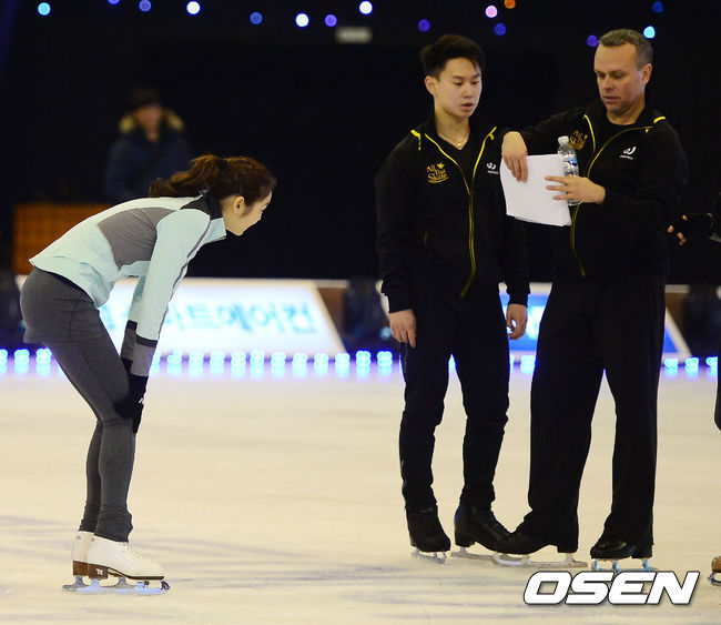 2일 오후 서울 올림픽공원 체조경기장 특설 아이스링크에서 열린 김연아 아이스쇼 연습 연습 리허설 공개 행사에서 김연아가 음악에 맞춰 연습을 한 후 휴식을 취하며 안무가 데이비드 윌슨을 바라보고 있다.
