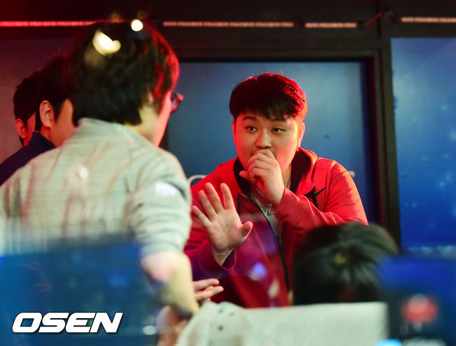 2일 오후 서울 용산 e스포츠센터에서 진행된 '핫식스 LOL 챔피언스(이하 롤챔스)' 4강 CJ 블레이즈와 나진 실드의 경기에서 CJ 블레이즈가 1,2세트 패배 후 3,4세트에서 승리한 후 5세트에 앞서 CJ 블레이즈 강현종 감독이 작전 지시를 하고 있다.