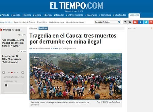 콜롬비아 서남부 카우카 지방의 불법 금광에서 붕괴 사고가 일어났다.