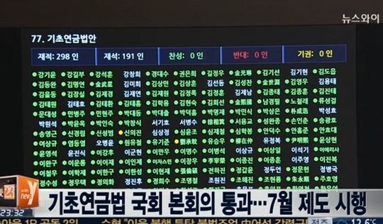 기초연금법이 가결되며 오는 7월부터 65세 이상 노인 중 소득하위 70%에게 국민연금 가입 기간과 연계해 월 10만원에서 20만원을 차등 지급하되 다만 국민연금 급여액이 기준연금액의 150%(30만원) 이하인 자에게는 20만원을 지급키로 했다.
