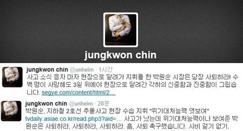 또 "세월호로 박대통령 퇴진 요구하는 자들이 이번에 박원순 퇴진 요구하는지 잘 지켜봅시다", "세월호는 민간선박이나 지하철 2호선은 서울시가 운영주체고 총책임자는 서울시장 박원순입니다. 손석희, 조국, 진중권, 뭐라고 얘기할지 재미있겠군요"라고 올렸다.