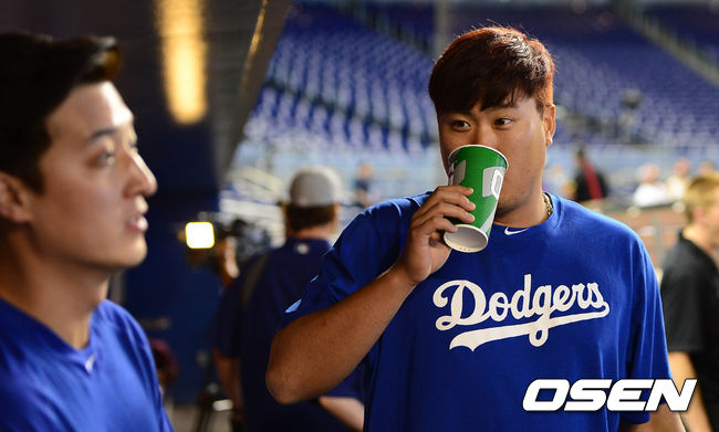 3일(이하 한국시간) 미국 플로리다주 마이애미 말린스 파크에서 열리는 '2014 메이저리그' 마이애미 말린스와 LA 다저스의 경기 시작전 류현진이 마틴과 이야기를 나누고 있다.