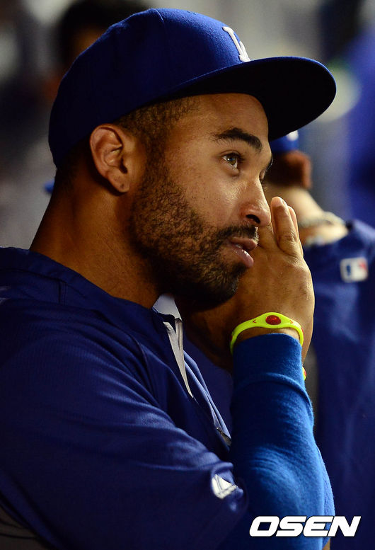 3일(이하 한국시간) 미국 플로리다주 마이애미 말린스 파크에서 열린 '2014 메이저리그' 마이애미 말린스와 LA 다저스의 경기 시작전 켐프가 덕아웃에서 장난을 치고 있다.