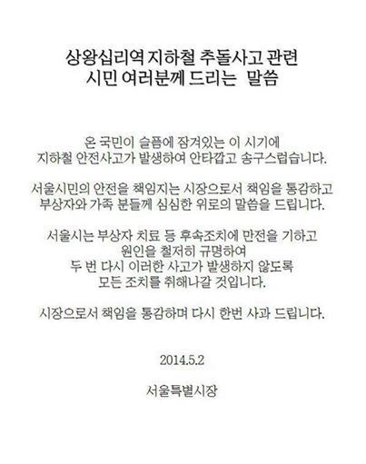 이어 "부상자에 대한 치료와 빠른 복구를 통한 지하철 정상화, 사고 원인규명을 통한 재발방지조치야 말로 위기에 영웅적 행동을 해주신 시민들에 대한 보답의 길이란 생각해 현장을 떠나지 못하고 상황실을 지켰습니다. 다시한번 시민의 안전을 책임지는 시장으로 책임을 다하지 못한 점 사과드립니다. 서울이 안전해야 시민이 안심한다는 생각으로 더 노력하겠습니다"고 사과의 말을 덧붙였다.