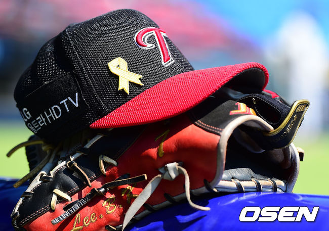 2일 오후 서울 잠실야구장에서 열리는 '2014 한국야쿠르트 세븐 프로야구' LG 트윈스와 두산 베어스의 경기에 앞서 LG 선수단 모자에 노란리본이 부착되어 있다.