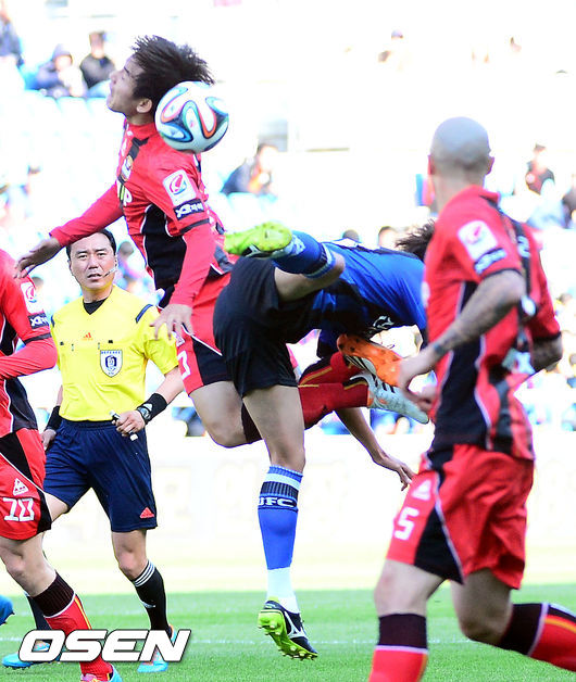 3일 오후 인천 축구 전용경기장에서 열린 '현대오일뱅크 K리그 클래식 2014' 인천 유나이티드와 FC 서울의 경기, 전반 이웅희와 인천 이효균이 공중볼을 다투고 있다.