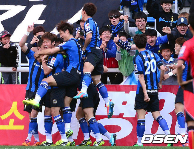3일 오후 인천 축구 전용경기장에서 열린 '현대오일뱅크 K리그 클래식 2014' 인천 유나이티드와 FC 서울의 경기, 후반 인천 이보의 선제골에 인천 선수들이 기뻐하고 있다.