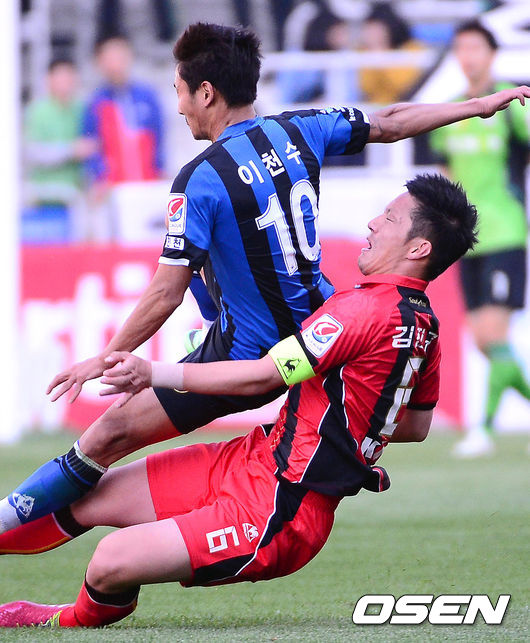 3일 오후 인천 축구 전용경기장에서 열린 '현대오일뱅크 K리그 클래식 2014' 인천 유나이티드와 FC 서울의 경기, 후반 볼다툼을 하던 인천 이천수와 서울 김진규가 충돌하고 있다.