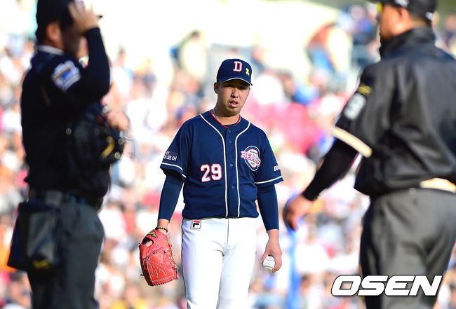 2회말 1사 2루 두산 유희관이 박근영 구심과 추평호 1루심의 판정을 기다리고 있다.