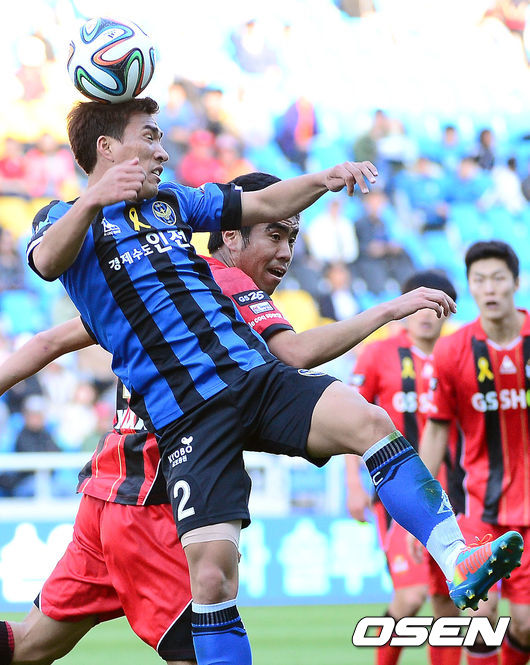 3일 오후 인천 축구 전용경기장에서 열린 '현대오일뱅크 K리그 클래식 2014' 인천 유나이티드와 FC 서울의 경기, 후반 인천 용현진과 서울 박희성이 공중볼을 다투고 있다.