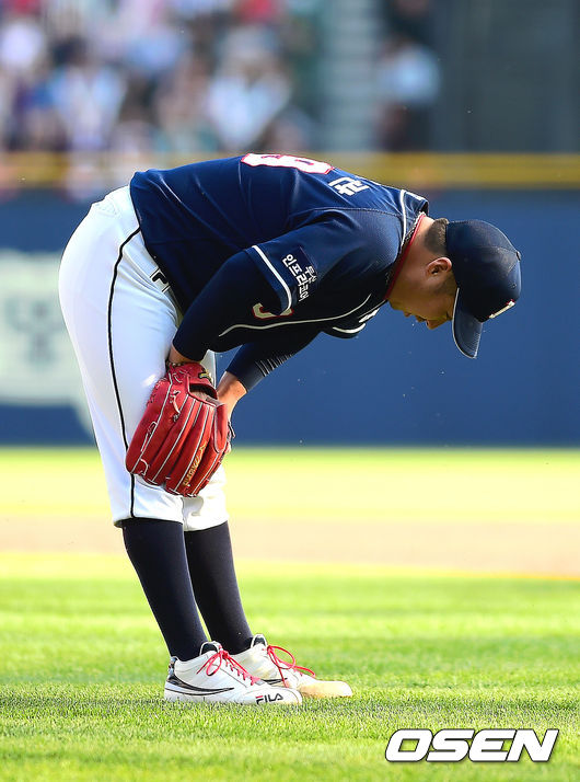 1회말 2사 1,2루 두산 유희관이 LG 이진영을 1루 앞 땅볼로 잡아낸 뒤 숨을 고르고 있다.