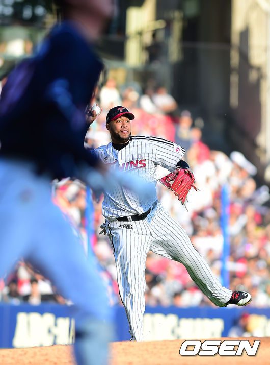 3회초 1사 LG 조쉬 벨이 두산 고영민의 3루 앞 땅볼을 잡아 1루로 송구하고 있다.