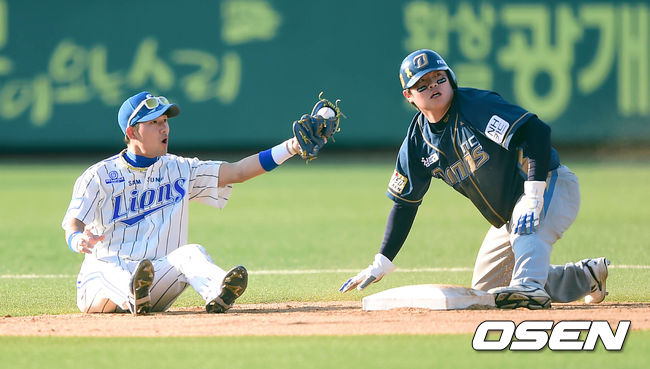 2회초 무사 1루 NC 손시헌 타석떄 삼성 김상수가 1루주자 권희동에게 도루를 허용하고 심판에게 어필을 하고 있다.