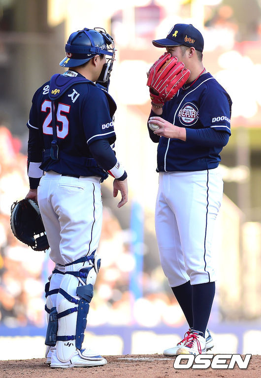 4회말 2사 1,2루 두산 유희관과 양의지가 마운드에서 이야기를 나누고 있다.