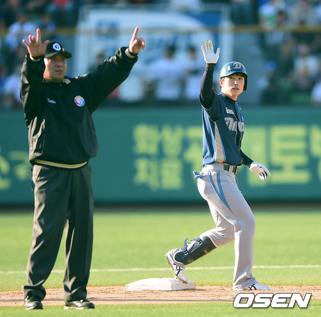 2회초 1사 1,3루에서 NC 오정복이 좌전 적시 2루타를 치고 타임을 외치고 있다.