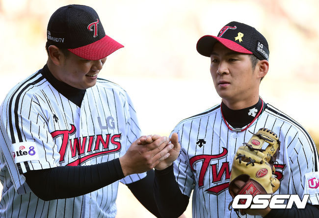LG 류제국과 오지환이 5회초 수비를 마치고 하이파이브를 하고 있다.