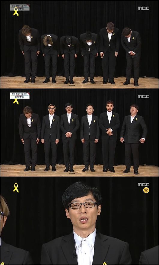 유재석은 멤버들과 제작진을 대표해서 애도의 뜻을 밝혔다. 그는 “믿을 수 없는 참사로 국민 모두가 안타까워하고 있다”면서 “세월호 참사로 힘든 가족 분들에게 머리 숙여 위로의 뜻을 전하고자 한다”고 말했다.