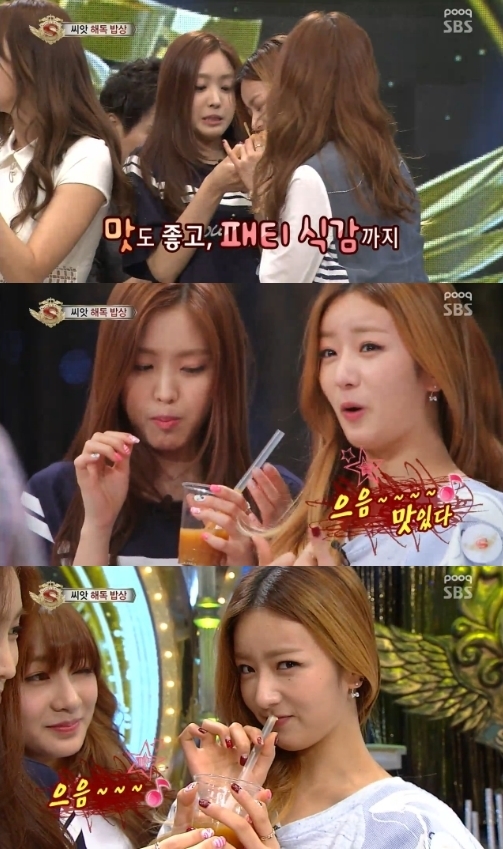 에이핑크는 3일 오후 방송된 SBS 예능 프로그램 '놀라운 대회 스타킹'(이하 '스타킹')에서 해독 햄버거를 보자마자 달려들었다. 고기가 아닌 특별한 패티로 만든 햄버거였지만 멤버들은 “맛있어!”를 연발하며 먹방을 선사했다. 또 보미는 해독 주스를 마시고 섹시하고 귀여운 표정을 지어 웃음을 자아냈다.