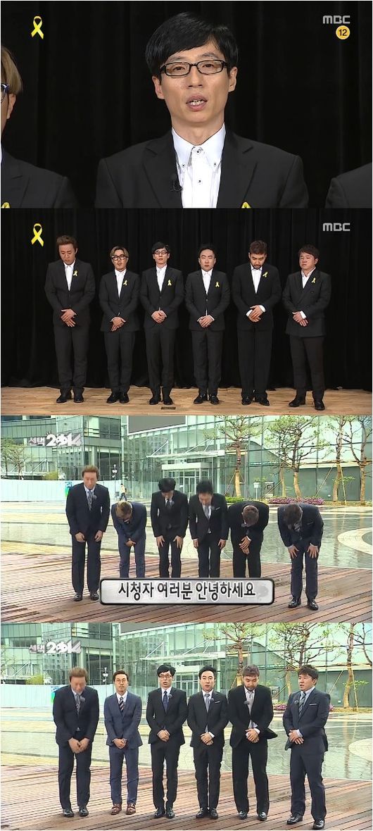 유재석은 다른 멤버들과 함께 고개를 숙인 후 “믿을 수 없는 참사로 국민 모두가 안타까워하고 있다”면서 “세월호 참사로 힘든 가족 분들에게 머리 숙여 위로의 뜻을 전하고자 한다”고 말했다.