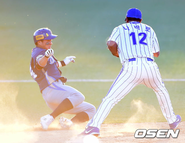 5회초 1사 1,2루에서 NC 박민우의 외야플라이때 2루주자 김태군이 3루로 향하다 급하게 귀루했지만 삼성 나바로에게 태그아웃 처리되고 있다.