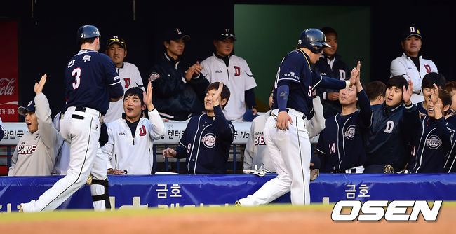 7회초 1사 2루 두산 칸투가 투런 홈런을 때린 뒤 동료들과 기뻐하고 있다.