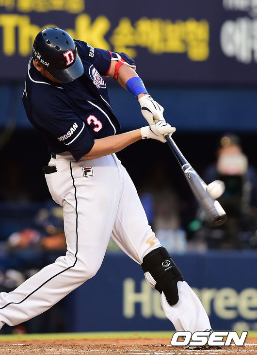 7회초 1사 2루 두산 칸투가 투런 홈런을 때리고 있다.