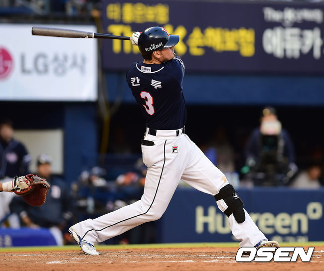 7회초 1사 2루 두산 칸투가 투런 홈런을 때리고 있다.