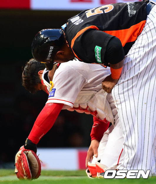 2일 오후 인천 문학구장에서 열린 '2014 한국야쿠르트 세븐 프로야구' SK 와이번스와 롯데 자이언츠의 경기, 6회초 무사 2루 롯데 박종윤의 1타점 적시타때 홈으로 쇄도하던중 히메네스가 충돌한 SK 정상호의 몸상태를 살피고 있다.
