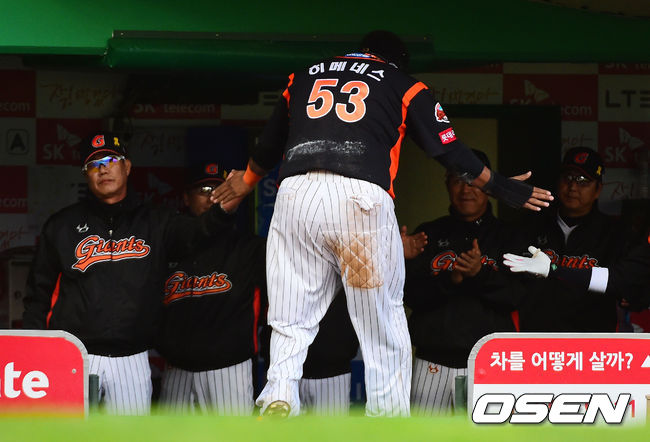 2일 오후 인천 문학구장에서 열린 '2014 한국야쿠르트 세븐 프로야구' SK 와이번스와 롯데 자이언츠의 경기, 6회초 무사 2루 롯데 박종윤의 1타점 적시타로 홈을 밟은 히메네스가 김시진 감독과 하이파이브를 나누고 있다.