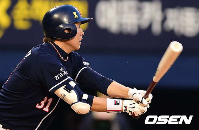 7회말 2사 만루 두산 정수빈이 싹슬이 3타점 3루타를 때리고 있다.