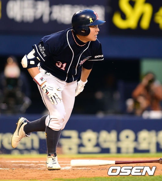 7회말 2사 만루 두산 정수빈이 싹슬이 3타점 3루타를 때리고 있다.