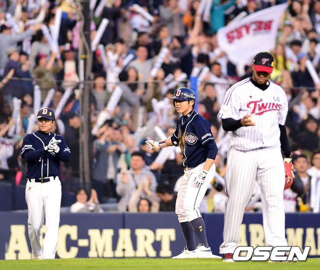 7회말 2사 만루 두산 정수빈이 싹슬이 3타점 3루타를 때린 뒤 기뻐하고 있다.