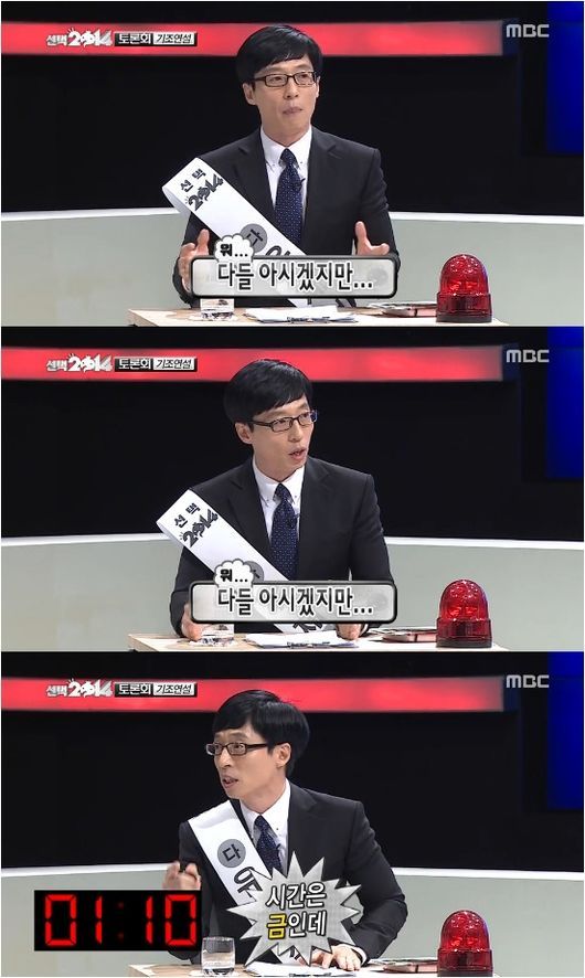 유재석은 3일 방송된 MBC 예능프로그램 ‘무한도전’에서 차세대 리더가 되기 위한 기조 연설을 하는 중 공약을 내걸었다. 그는 “방송 시간이 점점 늘어나고 있다”면서 “시간이 늘어나면서 밀도 있는 재미가 없다”고 말했다.